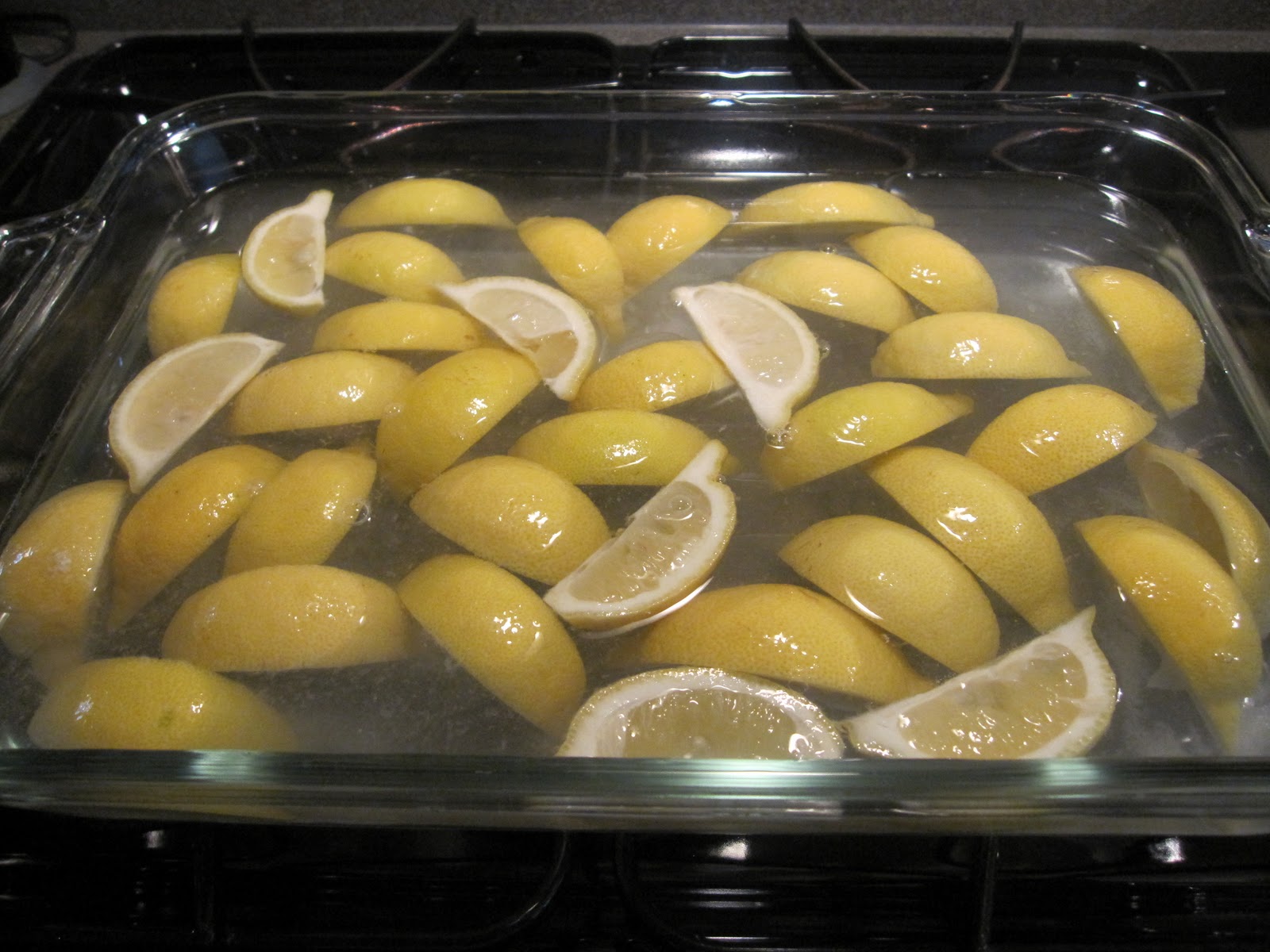 Wash lemons and cut in half lengthwise then cut each half lengthwise into thirds. Place in one layer in a large baking dish (I used a 13 x 9 x 2-inch Pyrex) and sprinkle with the salt. Add enough water to cover and bake for 3 hours.